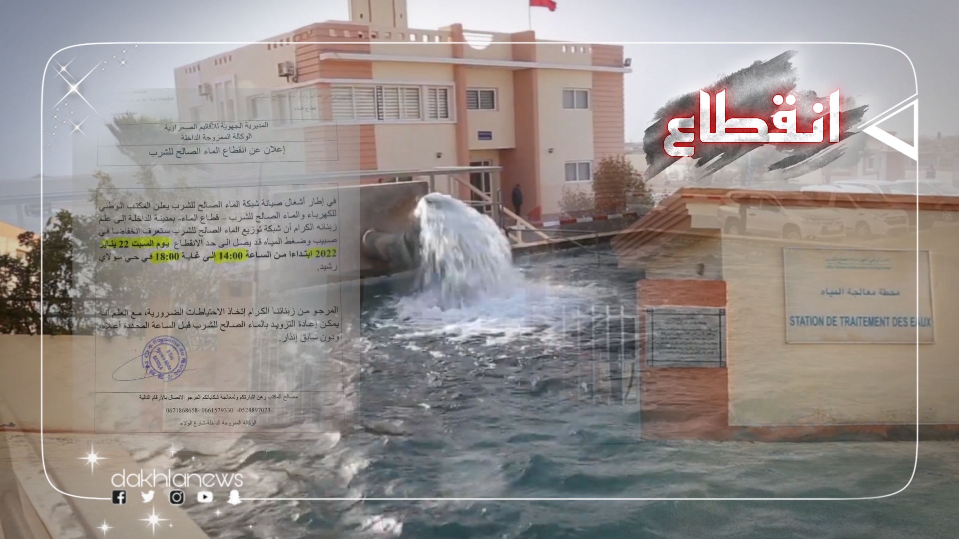 أعلن المكتب الوطني للكهرباء والماء الصالح للشرب-قطاع الماء، عن انخفاض مرتقب في صبيب وضغط المياه يصل إلى حد الإنقطاع يوم غداً السبت، من 14:00 إلى 18:00 مساءً، بحي مولاي رشيد.