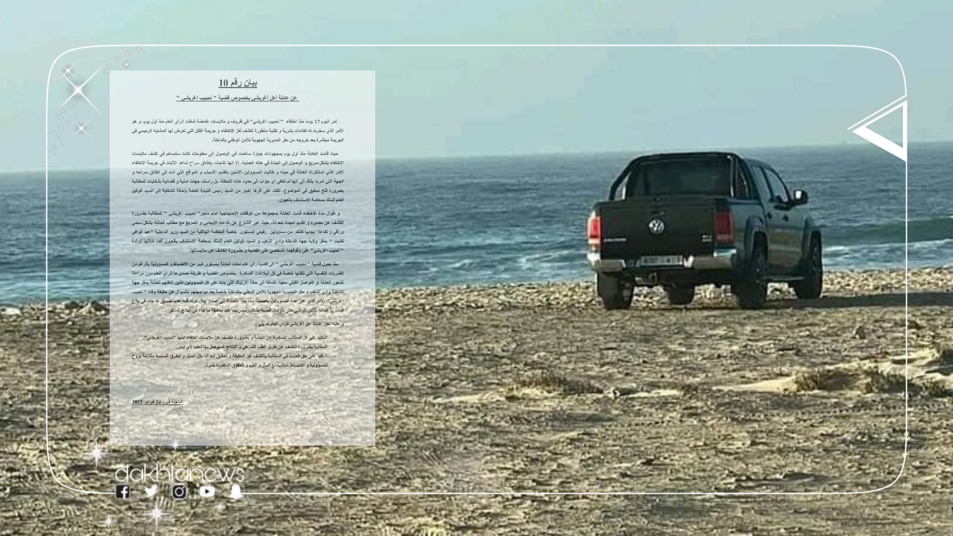 – التأكيد على كل المطالب الصادرة عن العائلة وبضرورة الكشف عن ملابسات اختفاء ابنها “لحبيب اغريشي”.
