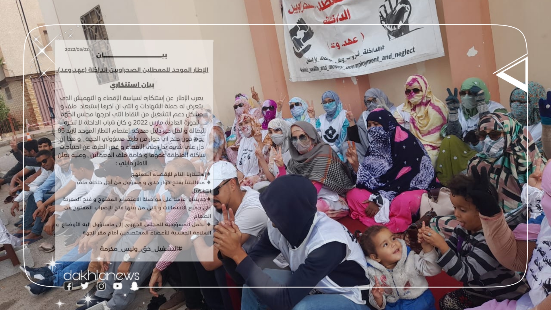 يعرب الإطار عن إستنكاره لسياسة الإقصاء والتهميش الذي يتعرض له حملة الشهادات والتي كان آخرها إستبعاد ملف ومشكل دعم التشغيل من النقاط التي أدرجها مجلس الجهة للدورة العادية مارس 2022 وكأن شباب الداخلة لا تنخره البطالة ولعل خير دليل معركة إعتصام الإطار الموحد لأزيد 85 يوم دون فتح أي حوار من طرف مسؤولي الجهة، وهذا إن دل على شيء يدل على الإقصاء وغض الطرف عن احتياجات ساكنة المنطقة عموما وخاصة ملف المعطلين، وعليه يعلن الإطار مايلي:
