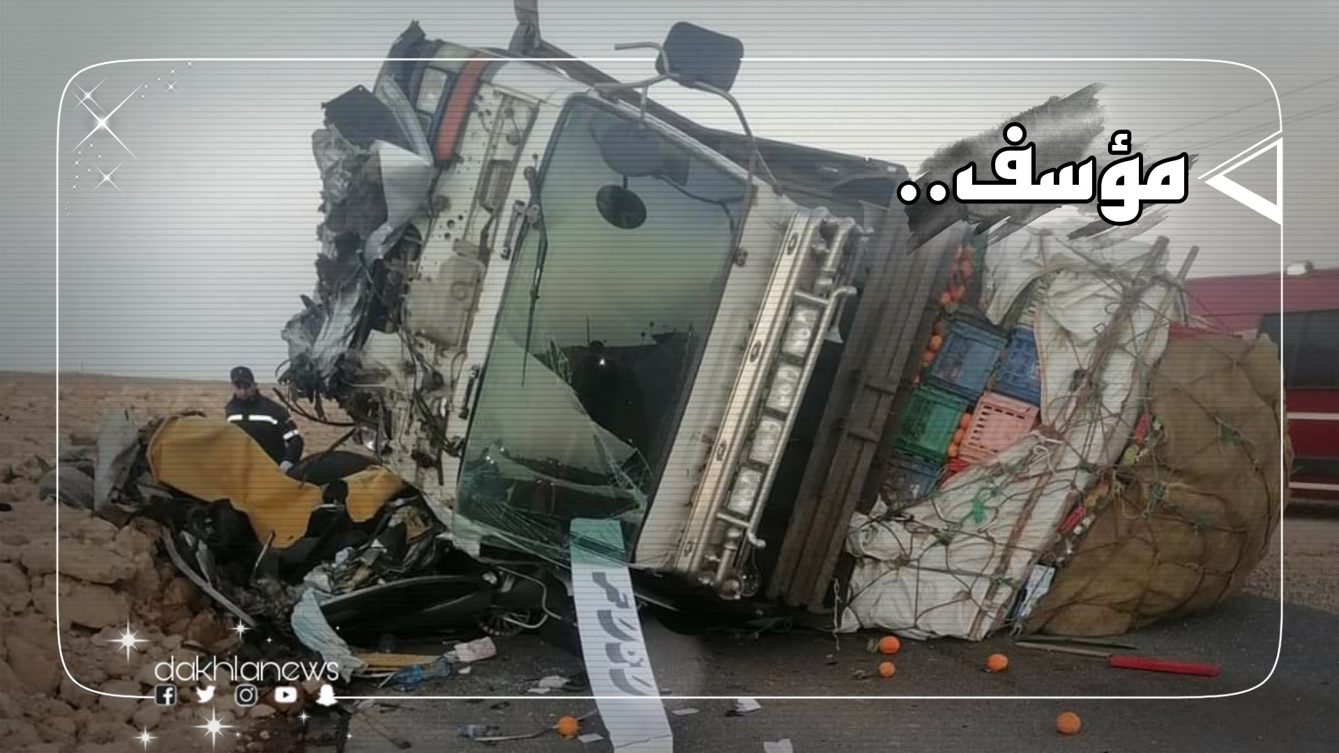 في حادث مأساوي جديد، شهد المدخل الجنوبي لمدينة الوطية في اتجاه العيون، مساء اليوم الأربعاء حادثة سير مميتة، جراء دهس شاحنة خاصة بنقل البضائع سيارة خفيفة.