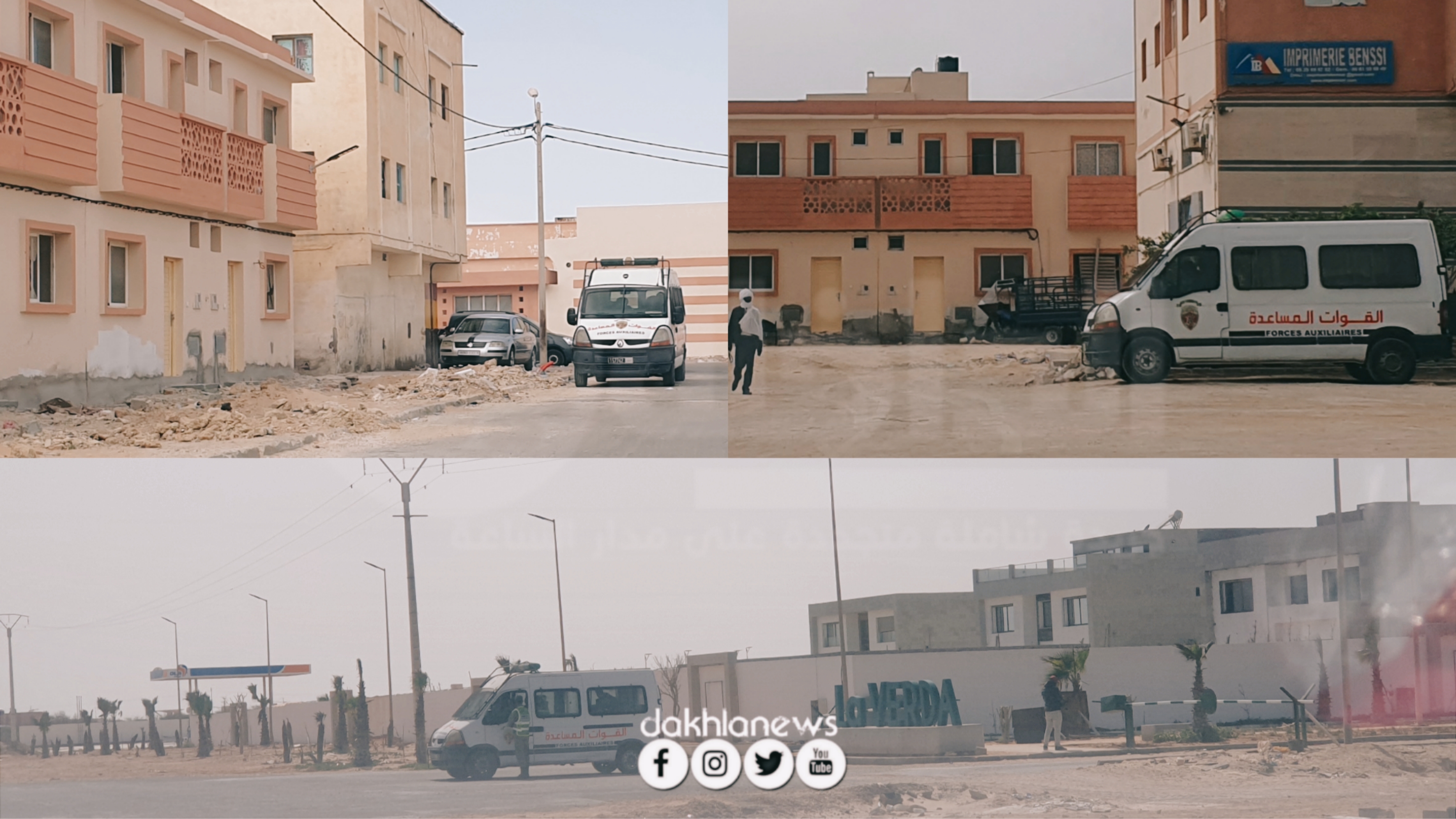 وتظهر الصور، تواجد عدد مهم من عناصر الشرطة والقوات المساعدة بمحاذاة مشروع بناء 152 منزلا بمدينة الداخلة، المُندرجة في إطار مشروع تأهيل حي مولاي رشيد، وكذا مشروع عقار الشرق المتواجد شمالي مدينة الداخلة.
