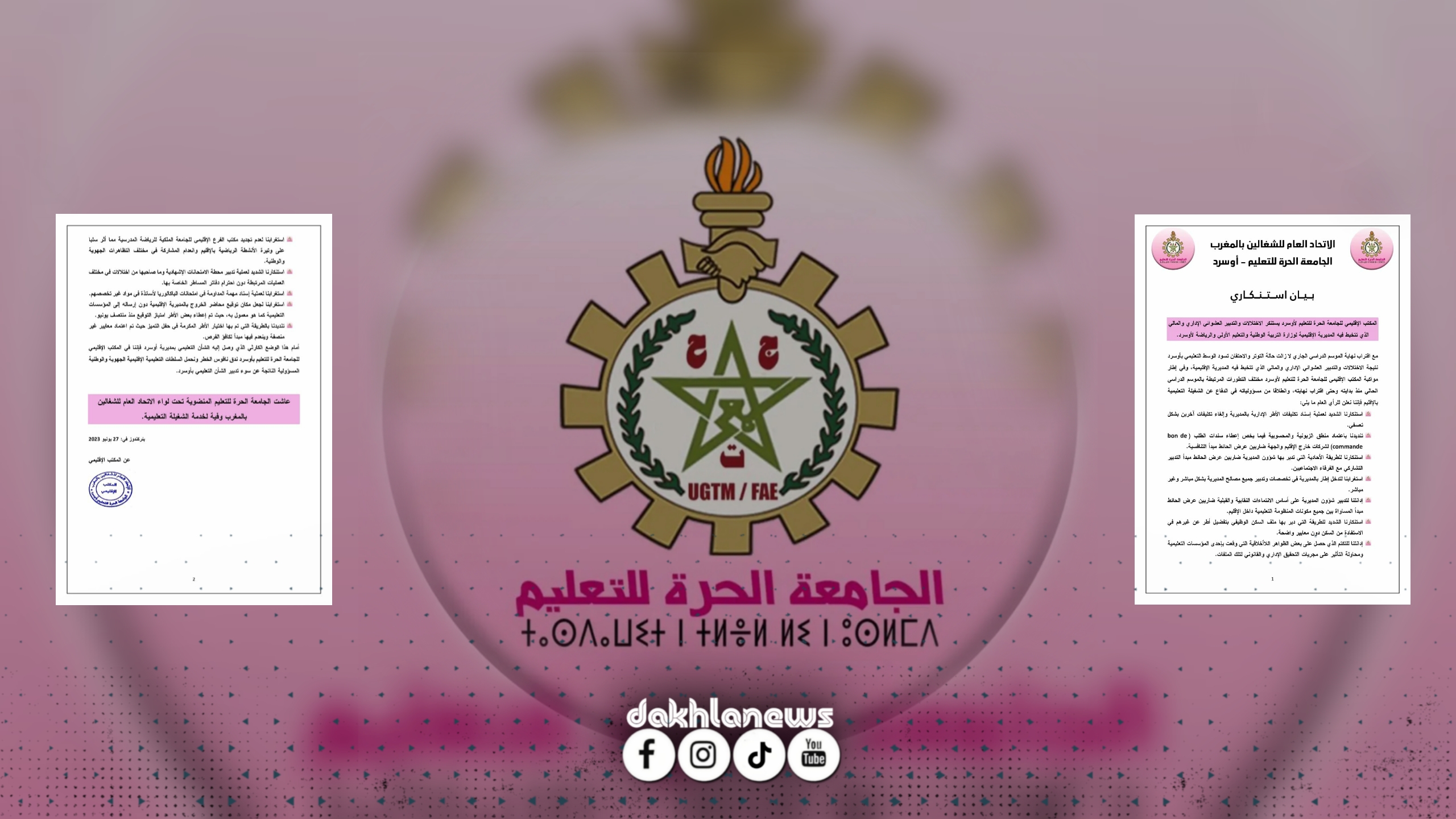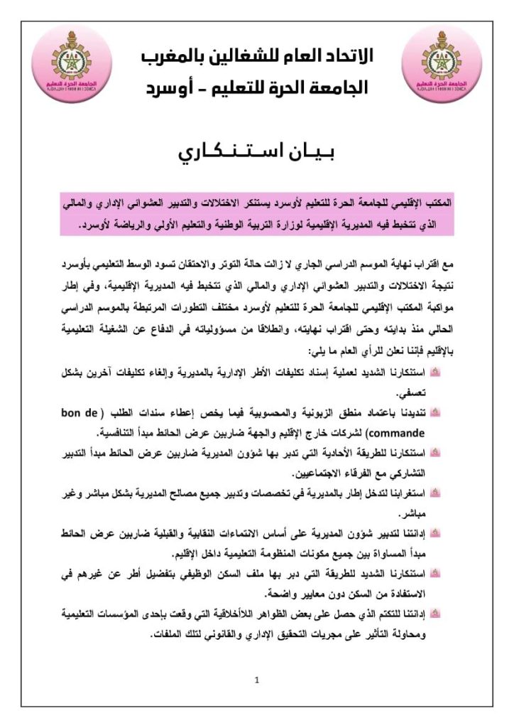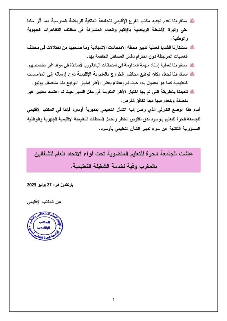 بیان استنکاري عن المكتب الإقليمي للجامعة الحرة للتعليم لأوسرد نشر في 28 يونيو 2023 الساعة 11 و 53 دقيقة الداخلة نيــوز: أخبار الداخلةالاتحاد العام للشغالين بالمغربالجامعة الحرة للتعليم لأوسردبيان استنكاري