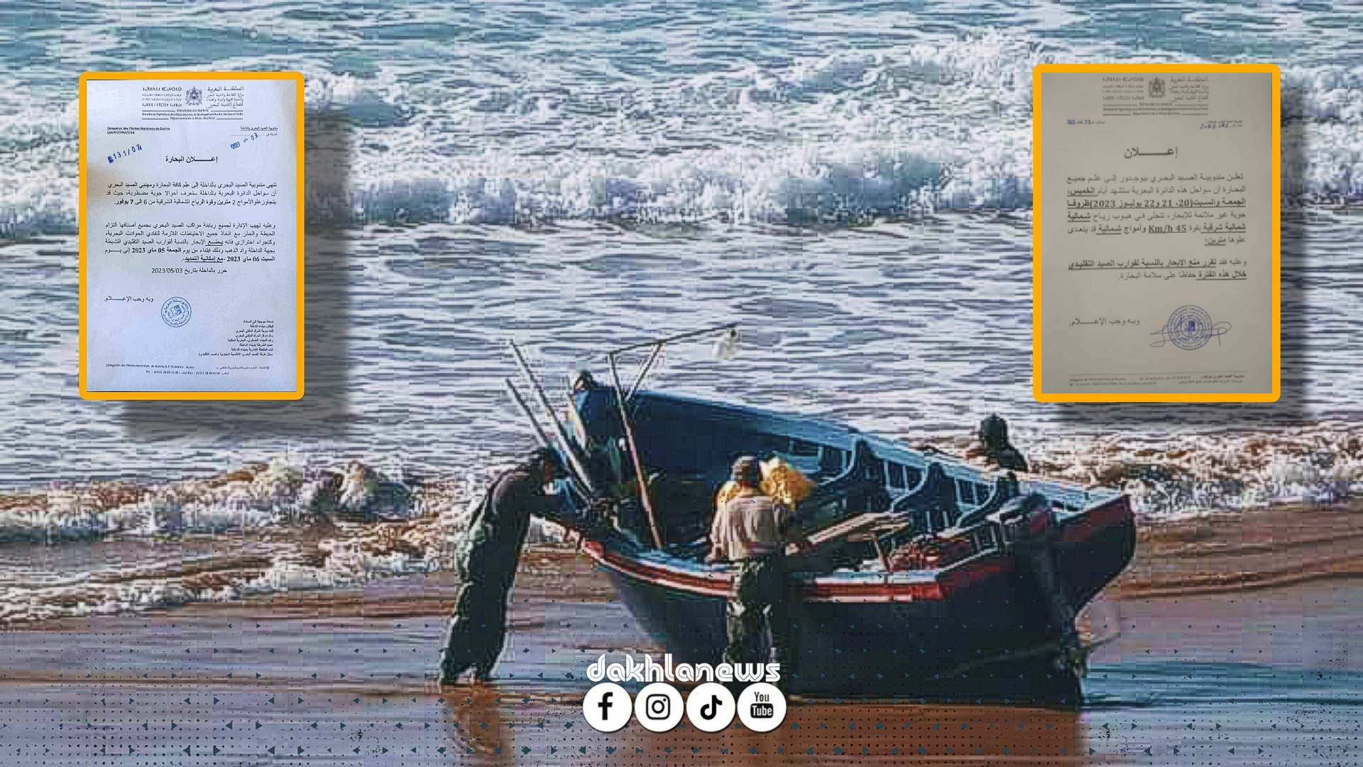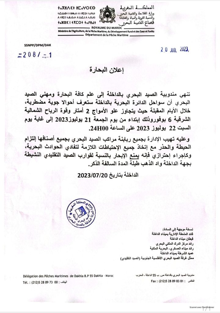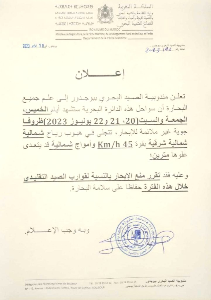 بدورها منعت إدارة الصيد البحري ببوجدور قوارب الصيد التقليدي ، من الإبحار ايام الخميس الجمعة والسبت( 20 و 21 و 22 يوليوز 2023) وذلك بسبب سرعة الرياح وارتفاع الامواج التي يتوقع ان يصل علوها لمترين.