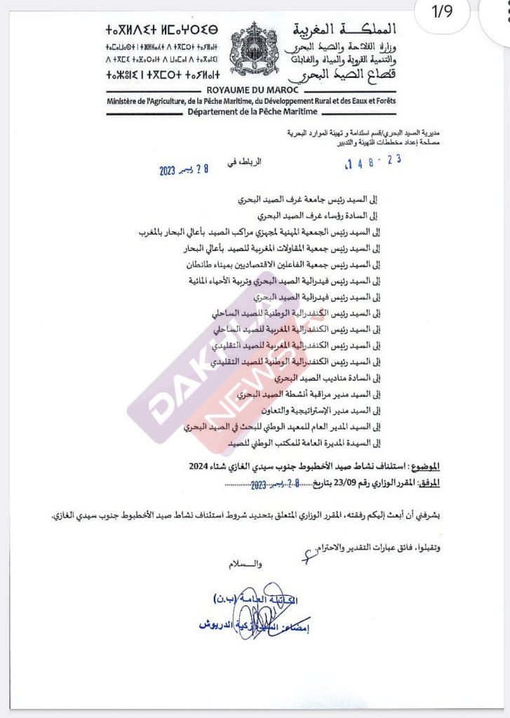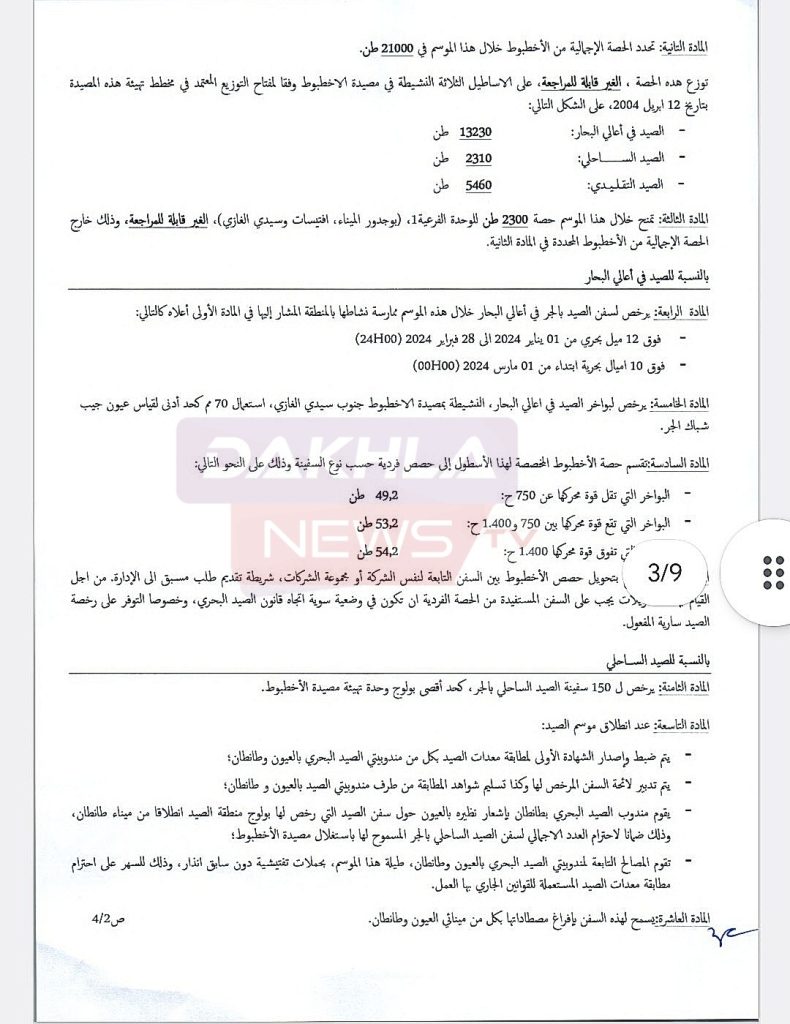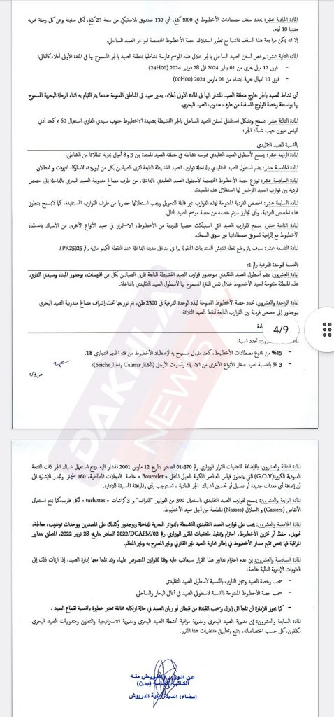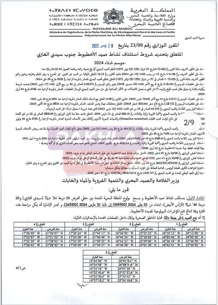 المقرر الوزاري رقم قرر في مادته الاولى استئناف نشاط صيد الأخطبوط و يسمح بولوج المنطقة البحرية الممتدة بين خطي العرض 26 درجة 24 شمالا (سيدي الغازي) و 20 درجة 46 شمالا الرأس الأبيض)، ابتداء من 01 يناير 2024 0000) إلى غاية 31 مارس 2024 2400).
