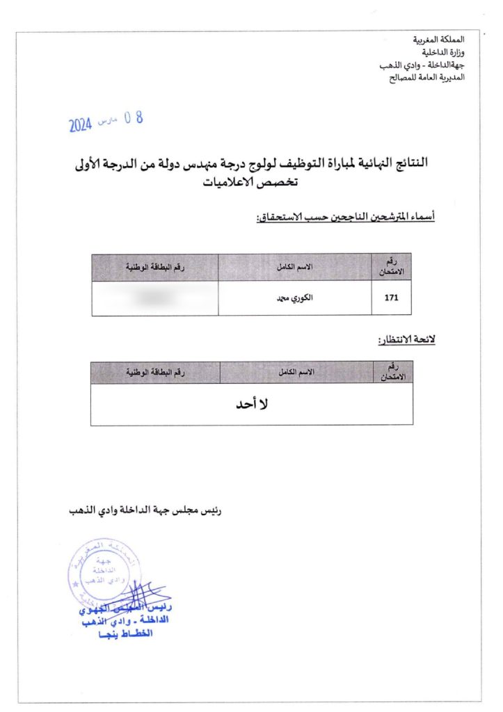 النتائج النهائية لمباراة التوظيف لولوج درجة منهدس دولة من الدرجة الأولى