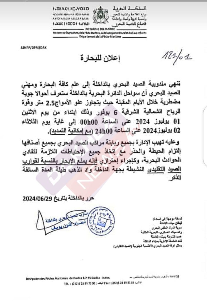 وفي هذا الصدد، قررت ادارة الصيد البحري بالداخلة، منع إبحار قوارب الصيد التقليدي، ابتداء من يوم الاثنين 01 يوليوز 2024، إلى غاية يوم الثلاثاء 02 يوليوز 2024 (مع إمكانية التمديد)، وذلك اثر الأحوال الجوية المضطربة التي ستعرفها سواحل الداخلة، خلال الأيام المقبلة، حيث يتجاوز علو الأمواج 2.5 متر وقوة الرياح الشمالية الشرقية 6 بوفور.