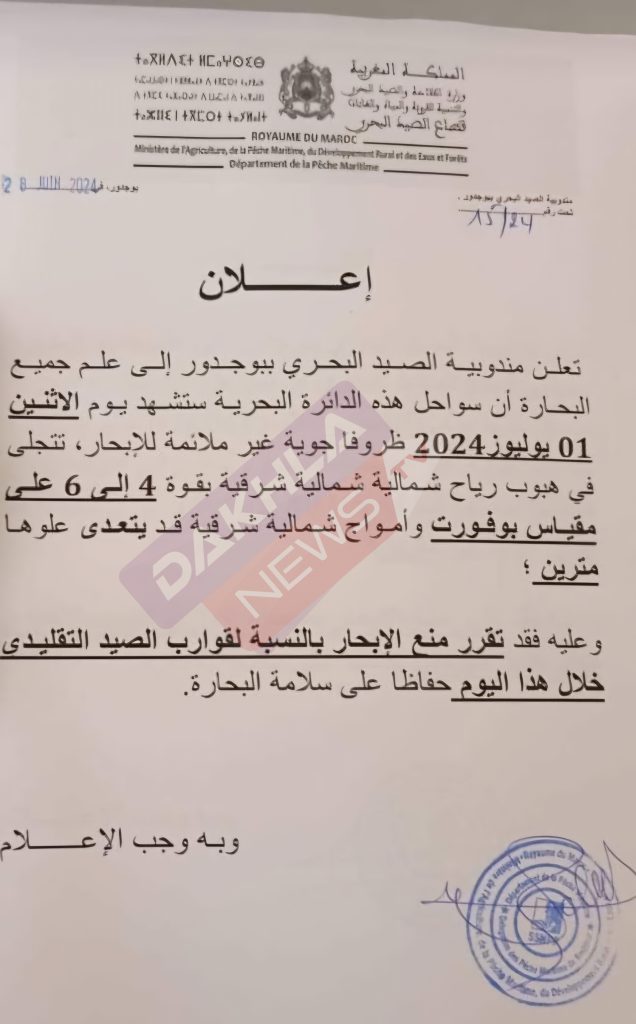 بدورها، اعلنت مندوبية الصيد البحري ببوجدور، عن منع الإبحار بالنسبة لقوارب الصيد التقليدي وذلك يوم الاثنين 1 يوليوز 2024، اثر هبوب رياح شمالية شمالية شرقية وعلو موج سيتجاوز مترين.