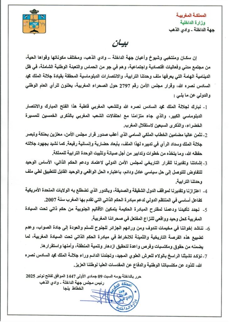 إن سكان ومنتخبي وشيوخ وأعيان جهة الداخلة – وادي الذهب، ومختلف مكوناتها وقواها الحية من مجتمع مدني وفعاليات اقتصادية واجتماعية، وهم في جو من الحماس والتعبئة الوطنية الشاملة، في ظل الدينامية الهامة التي يعرفها ملف وحدتنا الترابية، والانتصارات الدبلوماسية المحققة بقيادة جلالة الملك محمد السادس نصره الله، وقرار مجلس الأمن رقم 2797 حول الصحراء المغربية، يعلنون للرأي العام الوطني والدولي عن ما يلي: